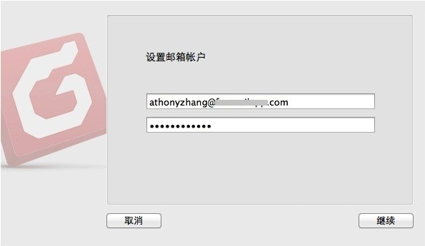 在彈出的對話框中填入完整的電子郵件地址和密碼后(如已開啟安全登陸需要使用客戶端專用密碼,成員如何綁定/關(guān)聯(lián)微信以及開啟安全登錄獲取客戶端專用密碼?),按住鍵盤上的“command”鍵不放,點擊“繼續(xù)”按鈕,進入手動配置界面。